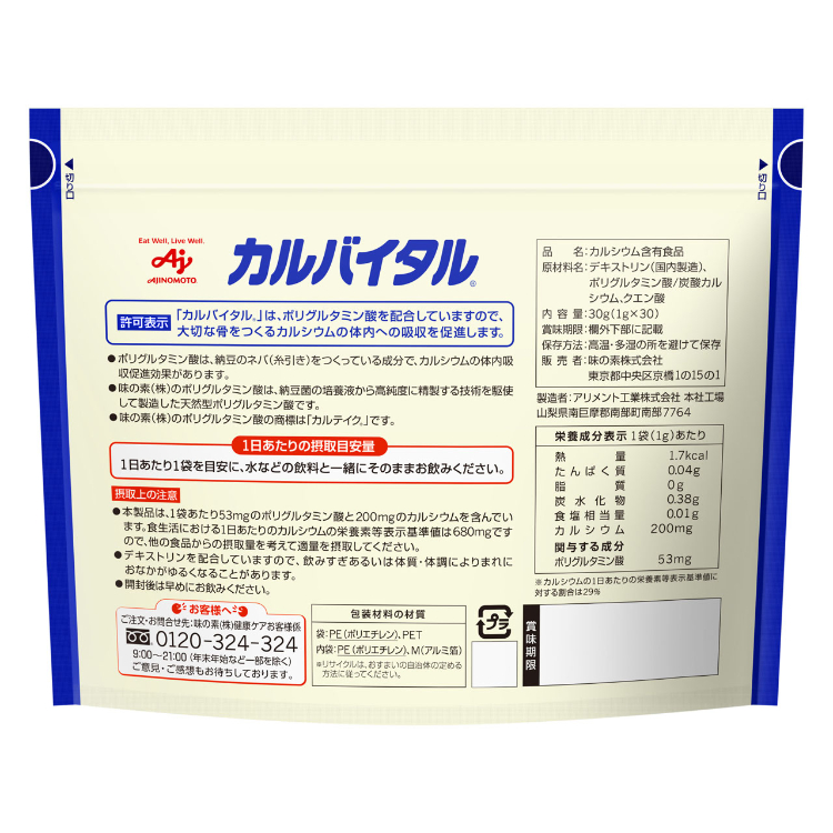 - デキストリン(国内製造)、ポリグルタミン酸/炭酸カルシウム、クエン酸