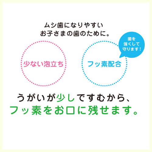 子供用むし歯(う蝕)予防歯磨きの定番商品!日常使いに適したフッ化物配合歯磨き粉(ソフトペーストタイプ)です。フッ素滞留性を高めた独自の新処方で、フッ素が口腔内のすみずみまで広がりやすく、歯や歯茎にやさしい低研磨性です。泡立ちが少ないため、ブラッシング後の洗口は1回だけでOKです。お子さまに好まれるやさしい香味(ストロベリー味)で、ブラッシング習慣の育成をサポートします。