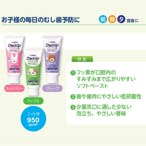 子供用むし歯(う蝕)予防歯磨きの定番商品!日常使いに適したフッ化物配合歯磨き粉(ソフトペーストタイプ)です。フッ素滞留性を高めた独自の新処方で、フッ素が口腔内のすみずみまで広がりやすく、歯や歯茎にやさしい低研磨性です。泡立ちが少ないため、ブラッシング後の洗口は1回だけでOKです。お子さまに好まれるやさしい香味(グレープ味)で、ブラッシング習慣の育成をサポートします。