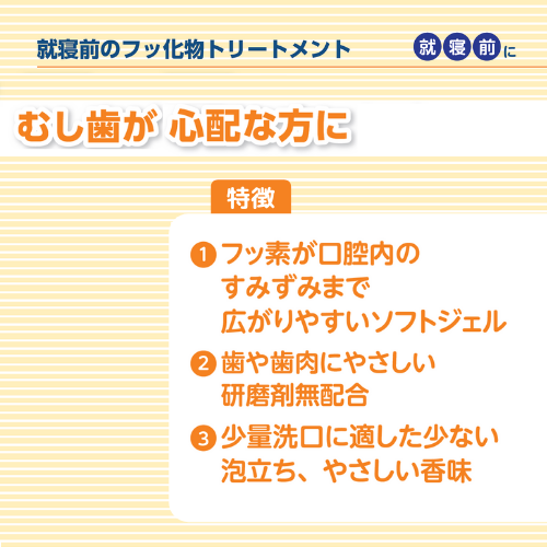 う蝕(むし歯)ハイリスクのケアに、いつもの歯磨きに加えて使用するフッ化物配合ジェル。矯正治療中の方にもオススメです。フッ素滞留性を高めた独自の新処方で、フッ素が口腔内のすみずみまで広がりやすいソフトジェルタイプの商品です。研磨剤無配合で、少量洗口に適した低発泡のジェルタイプ。やさしい香味で無理なくリスクケアができます。