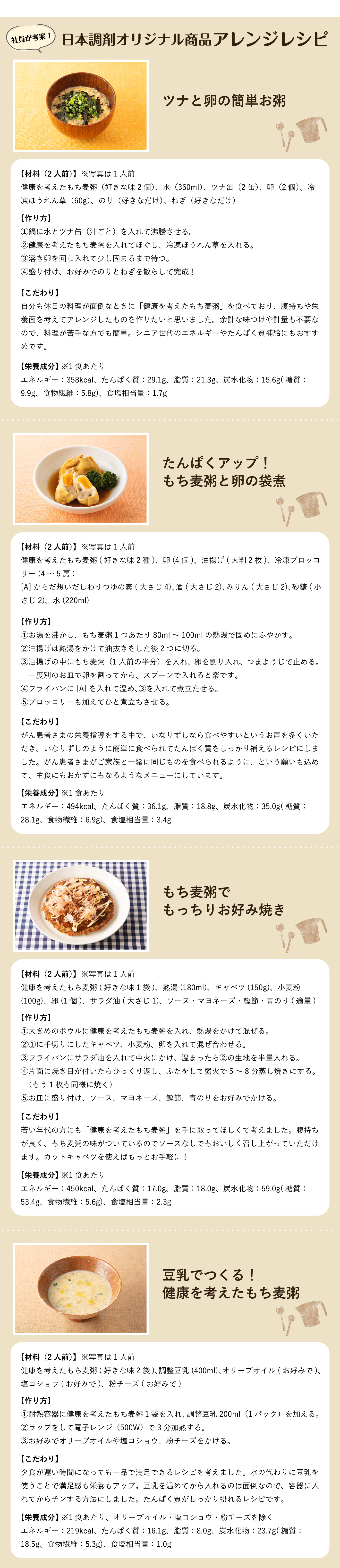 いつもの白いご飯をこのお粥に代えることで、食べる楽しみを実感しながらカロリーコントロールができます。また、シニアの方には、不足しがちな栄養素(たんぱく質、食物繊維)を手軽に補うこともできるのでおすすめです。