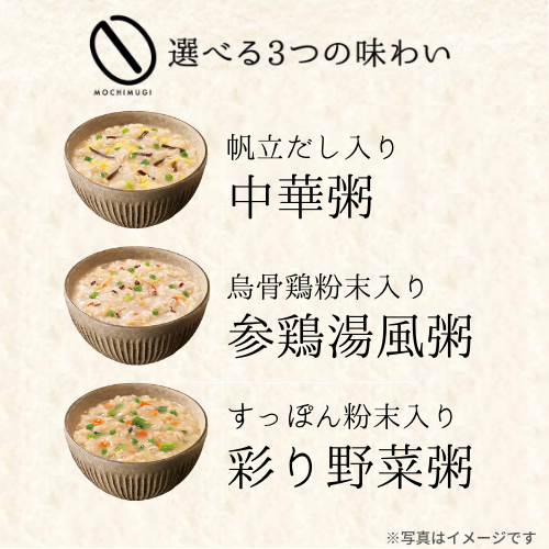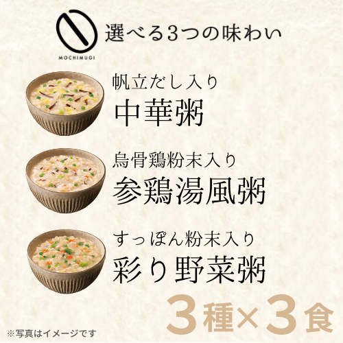 「帆立だし入り 中華粥」「烏骨鶏粉末入り 参鶏湯風粥」「すっぽん粉末入り 彩り野菜粥」の3種類がそれぞれ3食、計9食入り。
