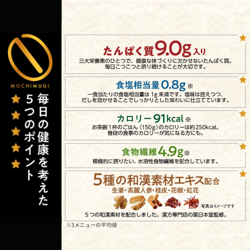 普段の食事のなかで摂りにくいもの(たんぱく質、食物繊維)を美味しく簡単に補えるだけでなく、つい摂りすぎてしまうもの(食塩相当量、カロリー)を抑えることにこだわりました。