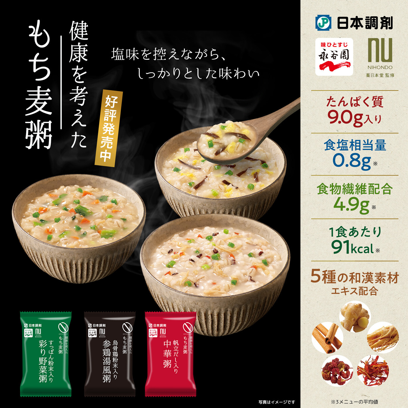 永谷園、薬日本堂、日本調剤の3社で共同開発した、オリジナルのもち麦粥。体と健康を考えた機能素材などが入ったフリーズドライのお粥です。
