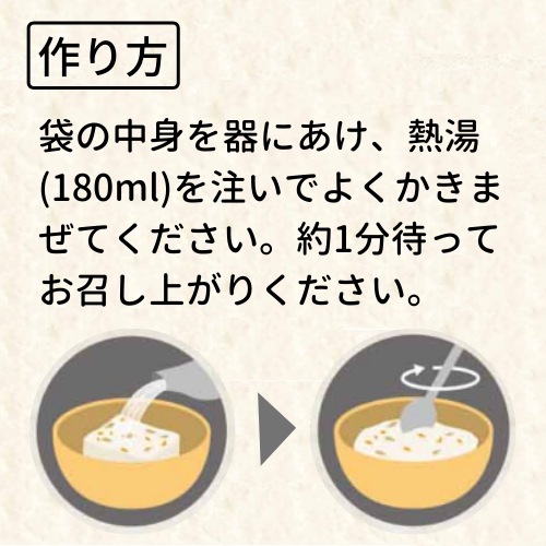 - 袋の中身を器にあけ、熱湯(180ml)を注いでよくかきまぜてください。約1分待って、お召し上がりください。