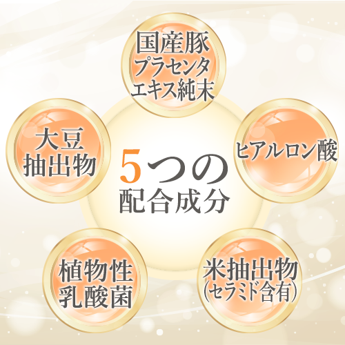 1日摂取目安量の2カプセルに、国産豚プラセンタエキス純末200mg配合しています。また、セラミドのほか、大豆抽出物、植物性乳酸菌といった自然由来の成分や、ヒアルロン酸も配合し、美容効果をアップ!