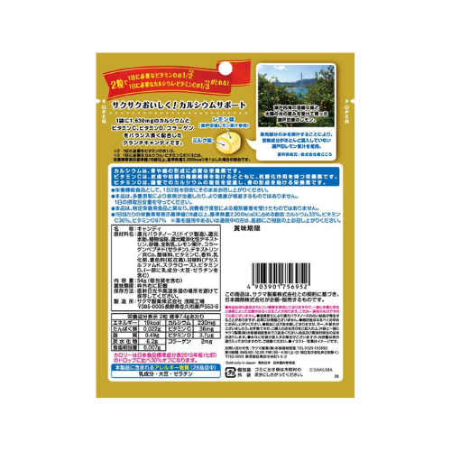 - 還元パラチノース(ドイツ製造)、還元水飴、植物油脂、還元難消化性デキストリン、砂糖、全粉乳、レモン果汁、コラーゲンペプチド(ゼラチン)、デキストリン / 貝Ca、酸味料、ビタミンC、香料、乳化剤、着色料(紅花黄)、甘味料(アセスルファムK、スクラロース)、ビタミンD、(一部に乳成分・大豆・ゼラチンを含む)