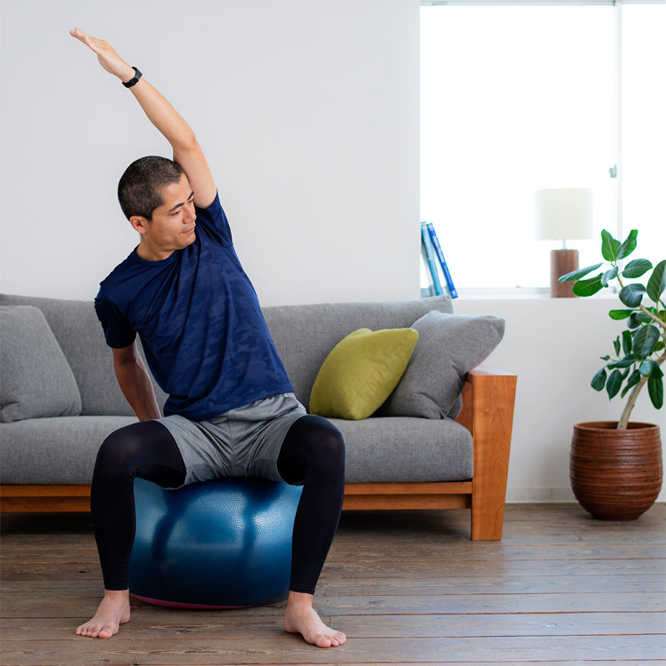 ボールの上に座り、まずは軽く弾んでみましょう。片足を上げて座ったりしてバランスをとる。次に上半身と足は動かさずに腰だけをゆっくり左右に傾け、骨盤まわりの体幹を意識してエクササイズ。 - 問い合わせ先(メーカー)