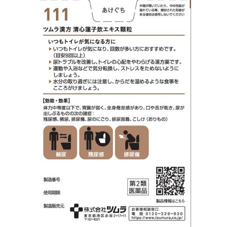 ツムラの漢方製剤【清心蓮子飲】は、漢方の原典である【和剤局方】に記載されている漢方薬で、体力中等度以下でいつもトイレが気になる方の【頻尿】、【残尿感】、【排尿痛】等に用いられています。