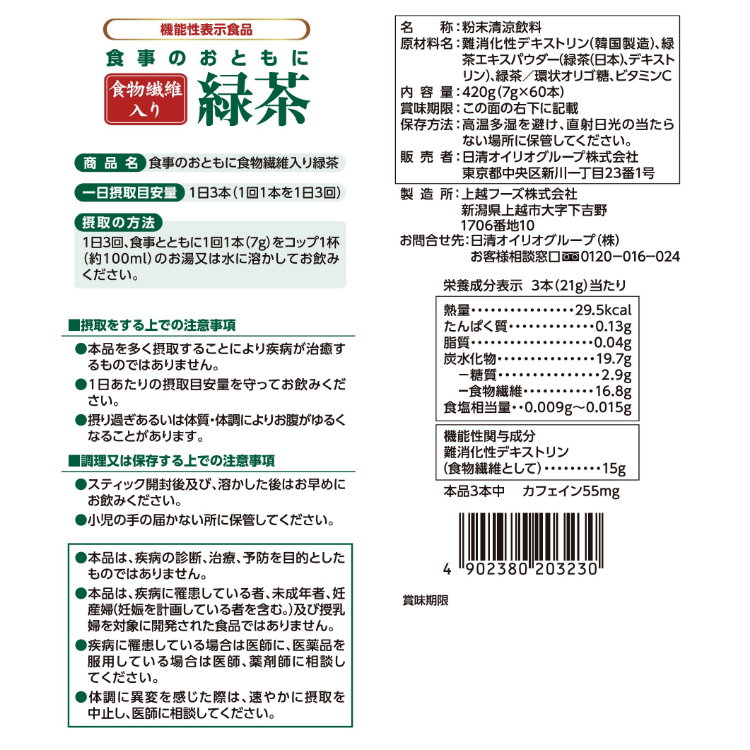 - 難消化性デキストリン(韓国製造)、緑茶エキスパウダー(緑茶(日本)、デキストリン)、緑茶/環状オリゴ糖、ビタミンC