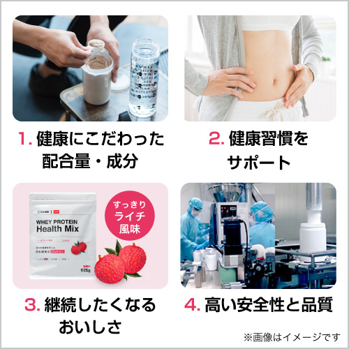 すっきりライチ風味は乳感がなく、清涼飲料水のようなクリアな飲み口のため、運動後にもスッキリと飲めるのが特長です。プロテインを飲み慣れていない方や、ホエイプロテインの味が苦手だった方にもぜひお試しいただきたい商品です。
