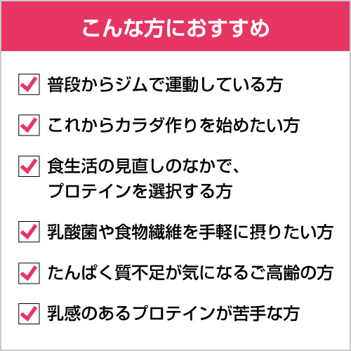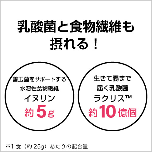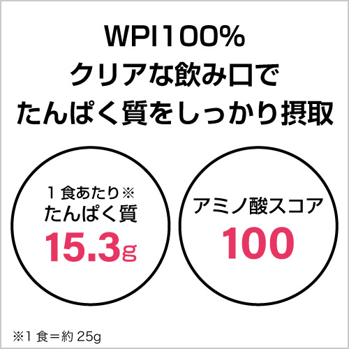たんぱく質として厳選されたWPI(ホエイ プロテイン アイソレート)を100%使用。1食(25g)あたり、たんぱく質15.3gとカラダ作りに重要な必須アミノ酸(体内で合成できない9種のアミノ酸)を全て配合し、アミノ酸スコア100を実現しました。また、日々の体調管理にもご活用いただけるよう、善玉菌をサポートする水溶性食物繊維(イヌリン)約5g、生きて腸まで届く乳酸菌(ラクリス™)約10億個も配合しました。