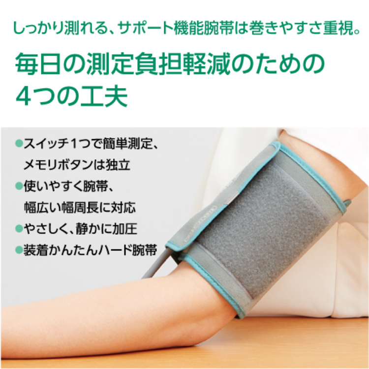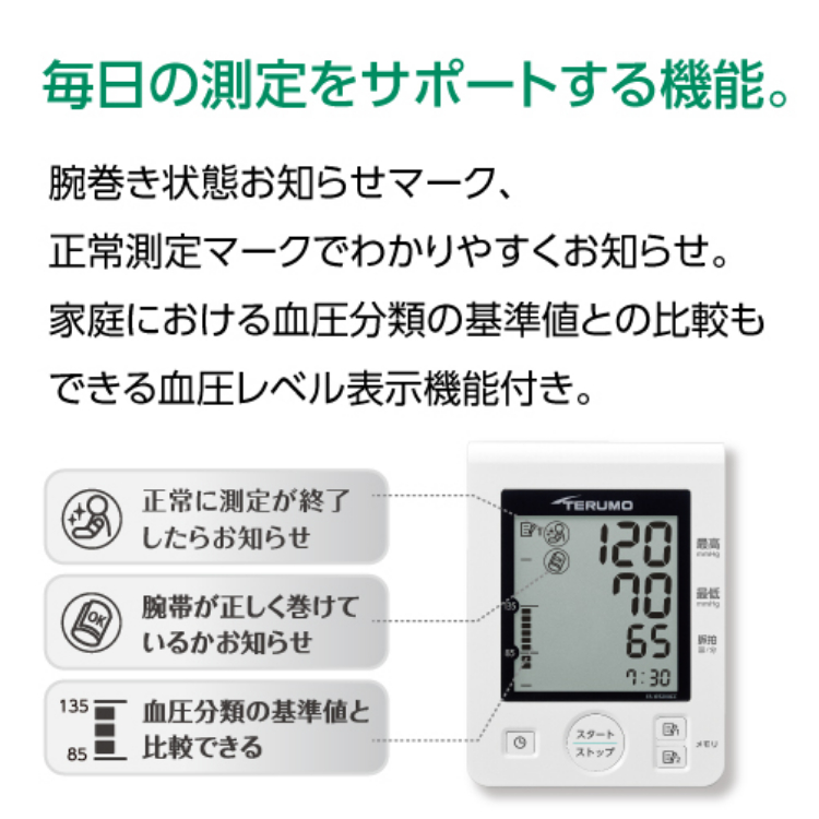 腕巻き状態お知らせマーク、正常測定マークでわかりやすくお知らせ。家庭における血圧分類の基準値との比較もできる血圧レベル表示機能付き。