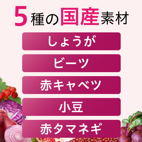 スーパーフードとして注目されるビーツ、赤キャベツ、赤タマネギ、小豆、黄金しょうがを配合。