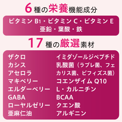 - イソマルトデキストリン(水溶性食物繊維)(国内製造)、還元麦芽糖、γ-アミノ酪酸、生姜末、酵母、カシス抽出物、レッドビート末、小豆末、L-カルニチン酒石酸塩、殺菌乳酸菌末、アセロラ末、エルダーベリー果汁末、ザクロ抽出物、マキベリー果汁末、ローヤルゼリー末、鶏肉抽出物、殺菌ビフィズス菌末、赤タマネギ末、赤キャベツ抽出物、亜麻仁油末(大豆を含む)、コエンザイムQ10末(乳成分を含む)/ビタミンC、クエン酸、シクロデキストリン、甘味料(アスパルテーム・L-フェニルアラニン化合物)、増粘剤(プルラン)、ピロリン酸第二鉄、ビタミンB1、ビタミンE、クエン酸カルシウム、ベニコウジ色素、香料、L-アルギニン、L-ロイシン、葉酸、L-イソロイシン、L-バリン、二酸化ケイ素