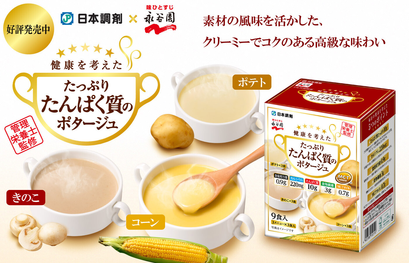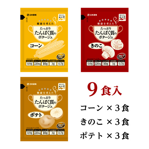素材の風味を活かした「コーン」「ポテト」「きのこ」の3種類がそれぞれ3食、計9食入り。