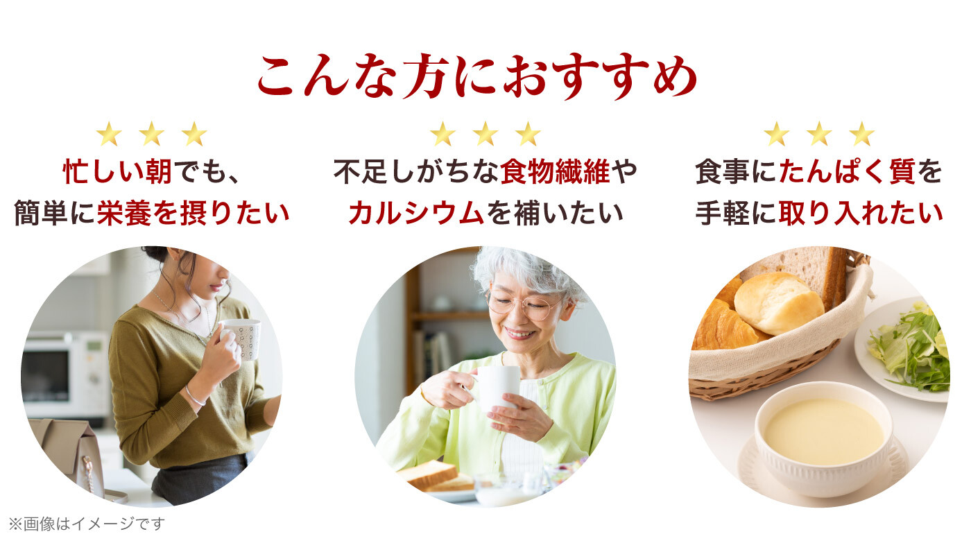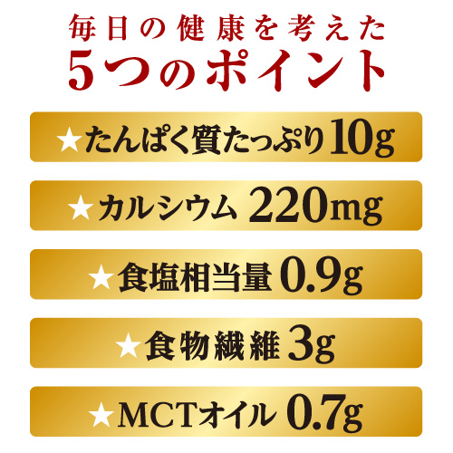 普段の食事のなかで摂りにくいもの(たんぱく質、食物繊維、カルシウム)を簡単に摂れるだけでなく、塩味をひかえました。また、中鎖脂肪酸を主成分とするMCTオイルを使用し、脂質にもこだわっています。
