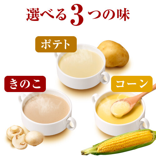 毎日食べても飽きないように、スープとして人気の高いコーン・ポテト・きのこの3種類をそろえました。