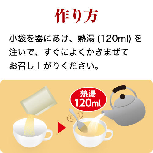 - 小袋を器にあけ、熱湯(120ml)を注いで、すぐによくかきまぜてお召し上がりください。
