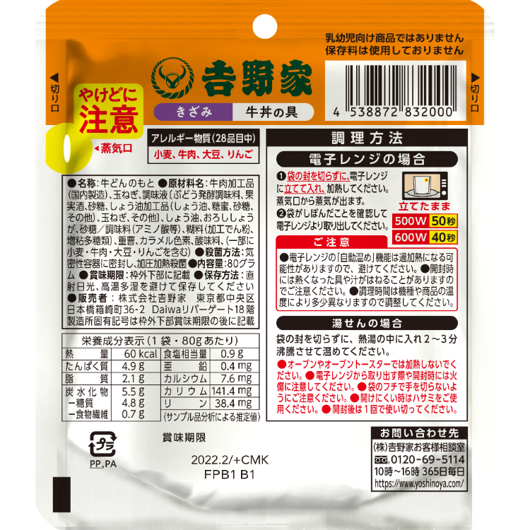 塩分を抑えながらも(食塩相当量1食あたり0.9g)吉野家の牛丼の美味しさを再現し、摂食嚥下機能が低下した方でも食べやすく加工しました。見た目も美味しく!(ユニバーサルデザインフード区分:舌でつぶせる)・電子レンジ(500W)で50秒加熱するだけの簡単調理。