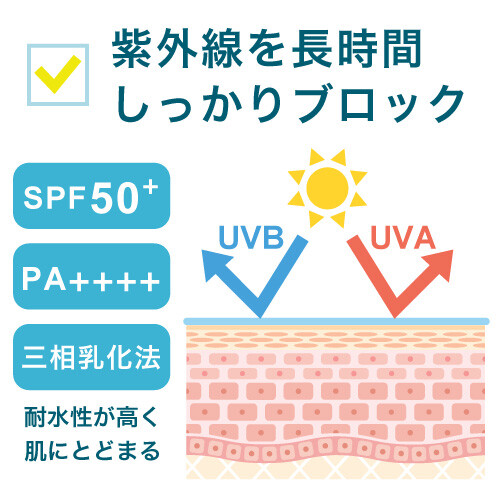 また、UVB(中波長紫外線)もSPF50+でしっかり防ぎます。