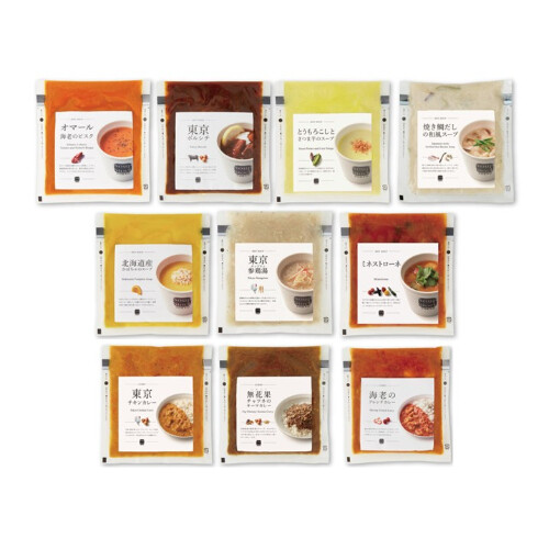 アソート内容:オマール海老のビスク、焼き鯛だしの和風スープ、とうもろこしとさつま芋のスープ、生姜入り和風スープ、ミネストローネ、とうもろこしとパプリカのチリビーンズスープ、北海道産かぼちゃのスープ×各1個
